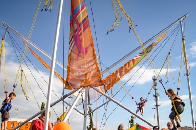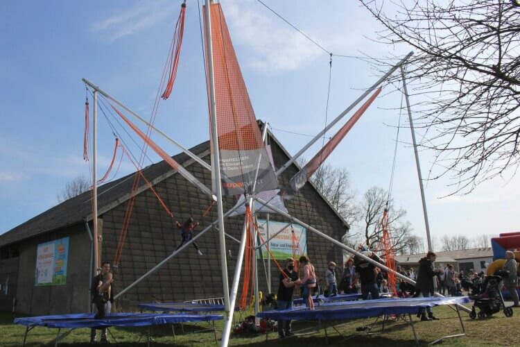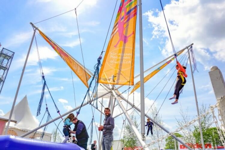 Sorgen Sie für Adrenalin pur und mieten Sie ein Bungeetrampolin für Ihre Veranstaltung! Gesichert durch ein spezielles Winden- und Elastikseilsystem können Sie bis zu 9 Meter hoch springen. Anders als auf einem normalen Trampolin können Sie sich, immer von den Seilen gehalten, dabei sogar um die eigene Achse drehen!
