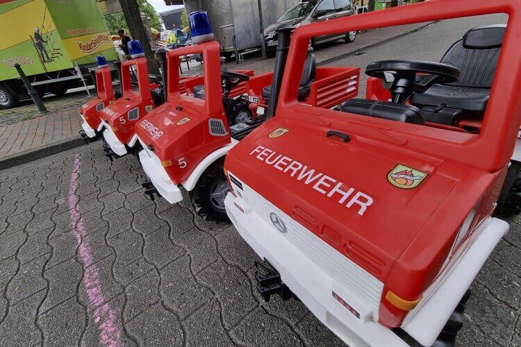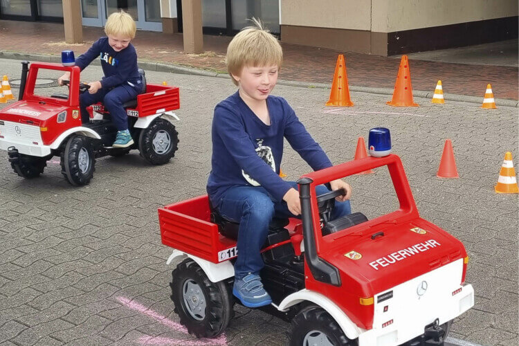 Der abgesteckte Parkour aus Aluminium-Zweipunkt-Traversen mit Verkehrsschildern lädt die Kinder zum Feuerwehr-Unimog Fahren ein. Im Vordergrund steht hier allerdings Bewegung: Durch die eigene Muskelkraft durchfahren die Kinder den individuellen Parkour möglichst fehlerfrei und ohne Panne.
