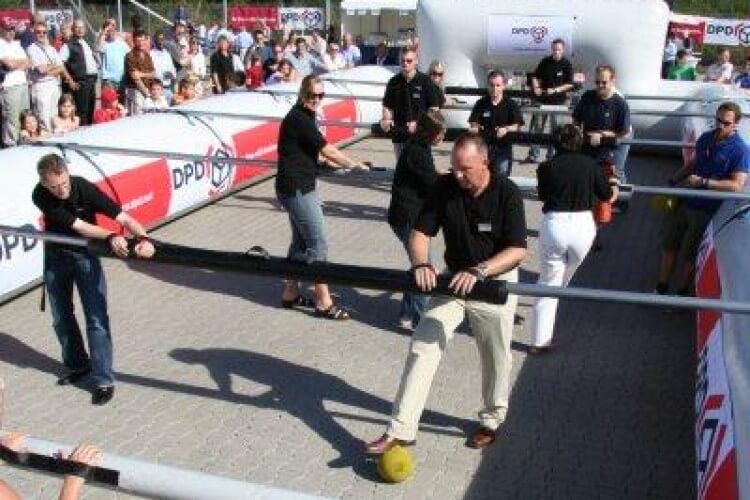 - Mieten Sie einen Tischkicker in Lebensgröße! Beim Human Table Soccer (Fläche: 15x8m) können zehn Fußballfans gegeneinander antreten. Die Teilnehmer werden als Kickerfiguren an den Drehstangen befestigt und können sich daher nur nach links und rechts bewegen, um sich den Ball im Feld zuzuspielen und dabei möglichst viele Tore zu erzielen. Hierbei wird Action, Spaß und Teamwork garantiert!