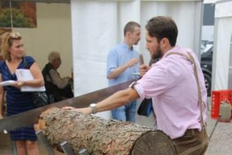 - Bei dem zünftigen Holzsägen (Fläche: 3x2m) mit der 2-Mann Zugsäge ist Teamwork angesagt.