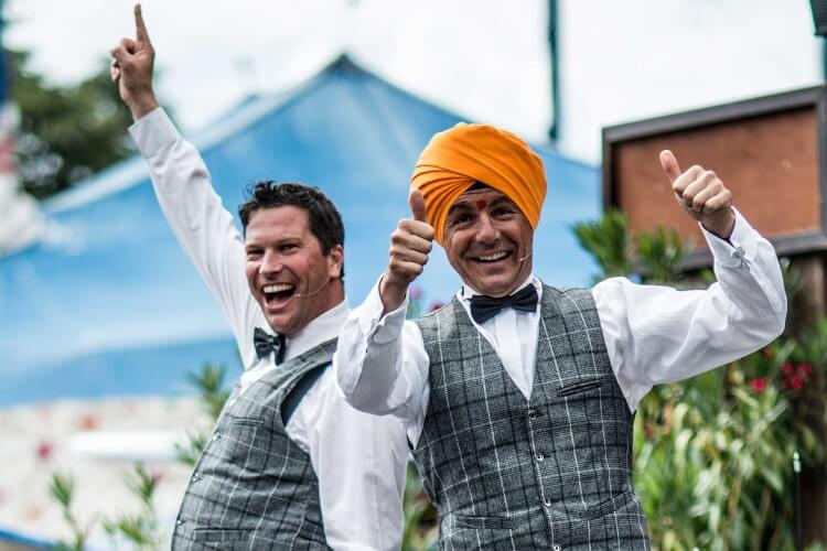 Ein Stapel Stühle auf dem Kinn, Flaschen, die sich wie von Geisterhand im Walzertakt bewegen und Teller, die sich der Erdanziehung entziehen – im Balanceakt zwischen Magie, Situationskomik und Jonglage der Superlative geht es vor allem um eins: Das Erzählen einer Geschichte. Nämlich der von Ron und Salim, dem lebensfrohen, chaotischen Inder, bei dem deutsche Redensarten ebenso strapaziert werden wie die Nerven seines Bühnenpartners. Zusammen sind sie Zeremonienmeister des modernen Slapsticks und des gehobenen, innovativen Entertainments.