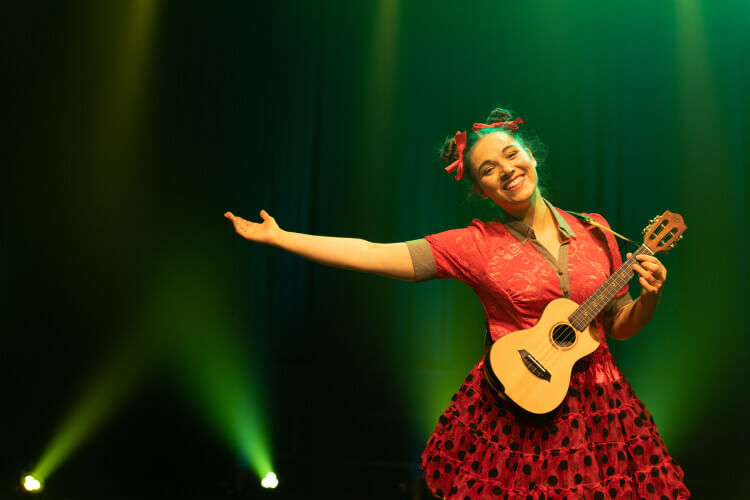 Viola singt sie in ihrem 4-Chord-Medley und begleitet sich dabei selbst auf ihrer Ukulele. Nicht nur das Mitsingen ist garantiert, das Publikum wird bei dieser Darbietung auch als Background mit eingebunden.