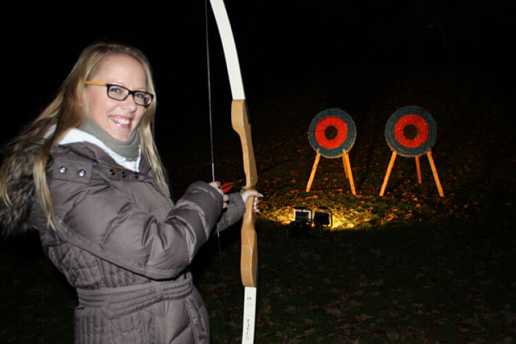 Zielscheibe, Abschussplatz und Umfeld sind erleuchtet. Die Teilnehmer warten gespannt auf den Ruf des Guides: „Feuer frei!“. Und schon sausen die Pfeile in Richtung der Zielscheibe. Schon nach wenigen Sekunden ist klar, ob es ordentlich Punkte fürs Team gibt oder ob sich der nächste in der Reihe umso mehr anstrengen muss. Selbst wenn mal ein Schuss daneben geht: Die Lernkurve beim Bogenschießen ist steil und so hat jeder Teilnehmer nach einiger Zeit echte Erfolgserlebnisse. Und spätestens bei der Schussrunde auf Luftballons kann auch der Teilnehmer mit einem weniger ruhigen Schusshändchen für ein deutliches Plus auf dem Punktekonto sorgen.
